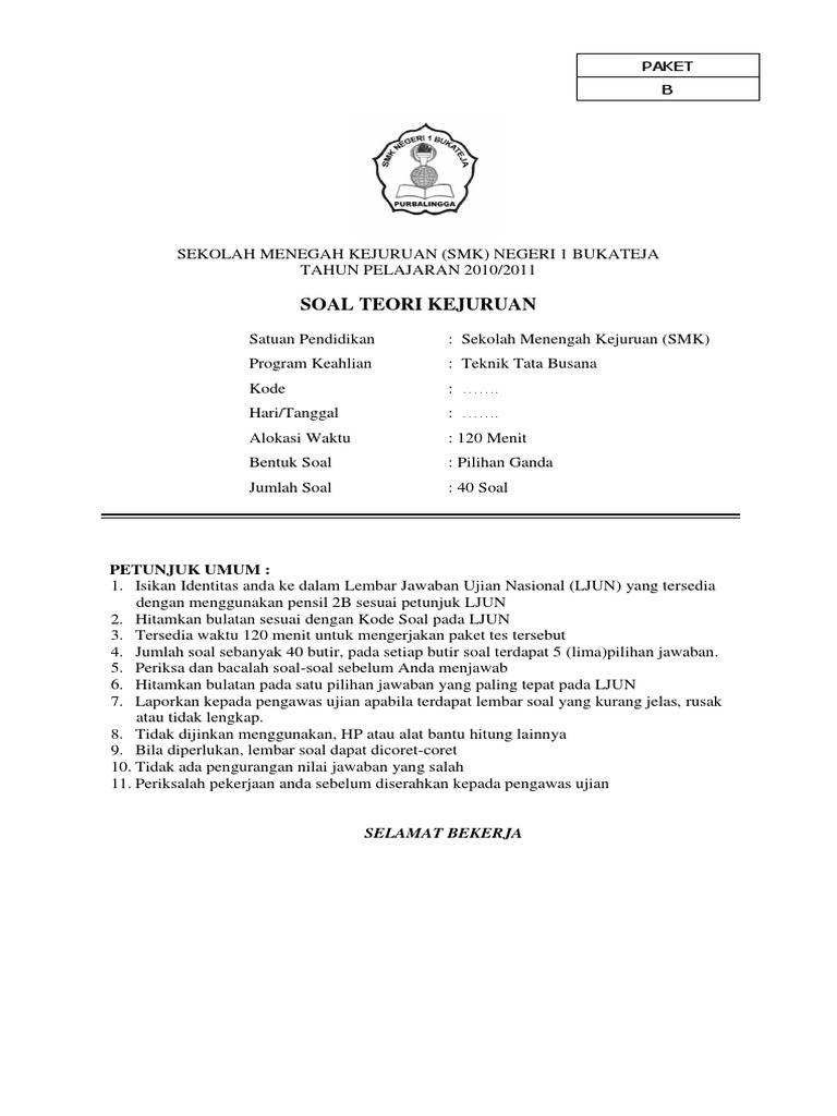 Soal tes masuk smk jurusan tata busana.