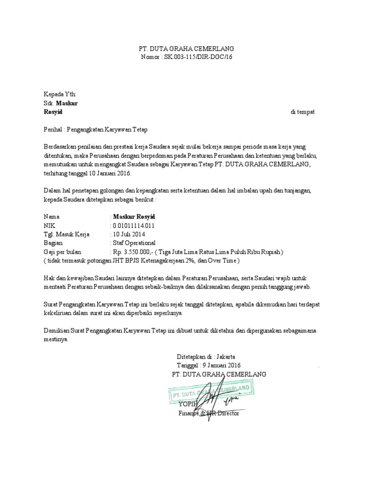 Surat pengangkatan karyawan tetap adalah sebuah surat yang dibuat oleh perusahaan atau instansi lain yang mana bertujuan untuk mengangakat seorang karyawan yang dulunya karyawan magang, ataupun karyawan kontrak menjadi karyawan tetap. Contoh surat pengangkatan karyawan tetap legal akses surat pengangkatan karyawan a a surat keputusan no tentang pengangkatan karyawan tetap menimbang berdasarkan pdf document. 4 atur kontrak kerja lebih mudah dengan talenta. Contoh sk pengangkatan karyawan tetap rumah sakit guru ilmu sosial. Save save surat permohonan menjadi karyawan tetap.docx.